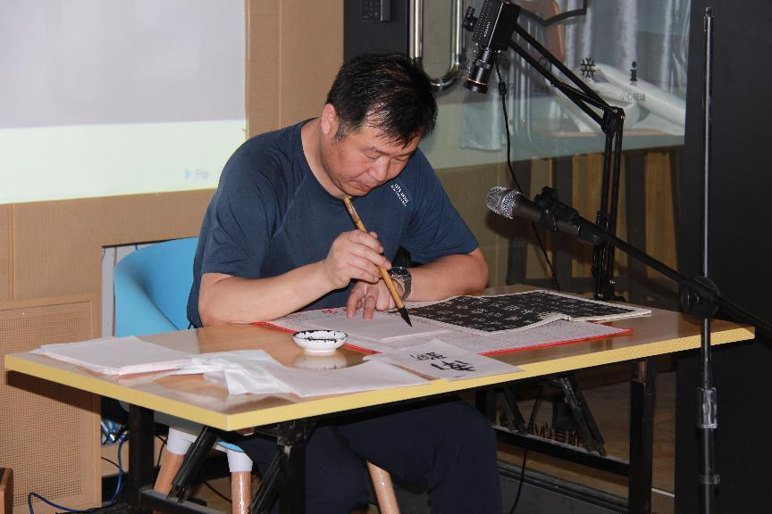 本次讲座诚邀张涛老师为同学们讲解毛笔的书写方法。张老师现场挥毫泼墨,让学生零距离感受书法的魅力。毛笔属于软笔,很难控制力道,张老师耐心细致的为同学们讲解了如何握笔控笔。